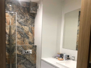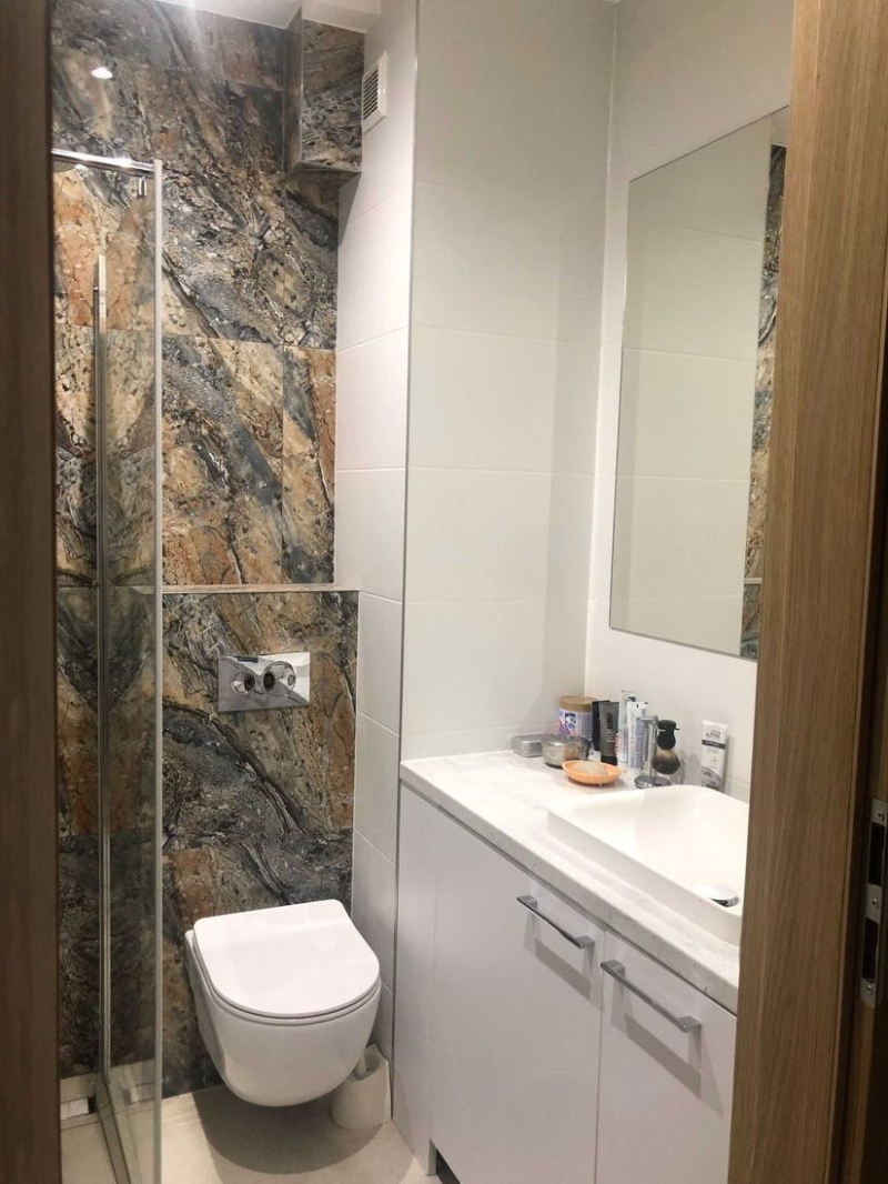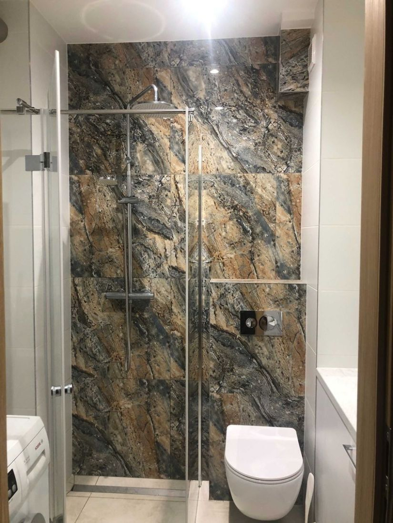 - Łazienka z WC – kabina prysznicowa typu walk-in z deszczownicą, wejście z przedpokoju,
