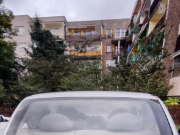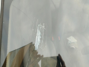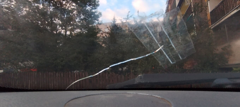 Pojazd posiada szereg uszkodzeń. Przednia szyba pęknięta w