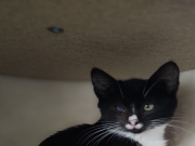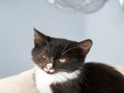 Krokiet - czarny z białym krawatem chłopczyk urodzony w lipcu 2025. Jest przepięknej urody dostojnym kocurkiem. Przeszedł koci katar, który pozbawił go widzenia w jednym oku, drugie jest zdrowe.