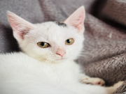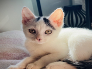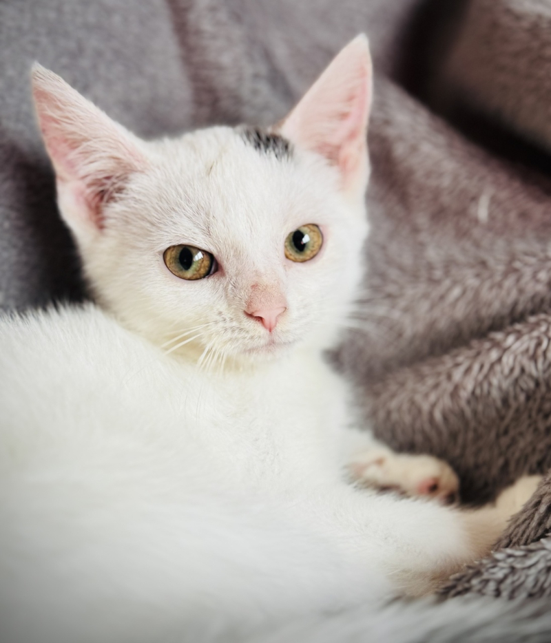 Lotka – subtelna koteczka z jedną czarną plamką na głowie. Delikatna, przytulaśna i bardzo ciekawska.