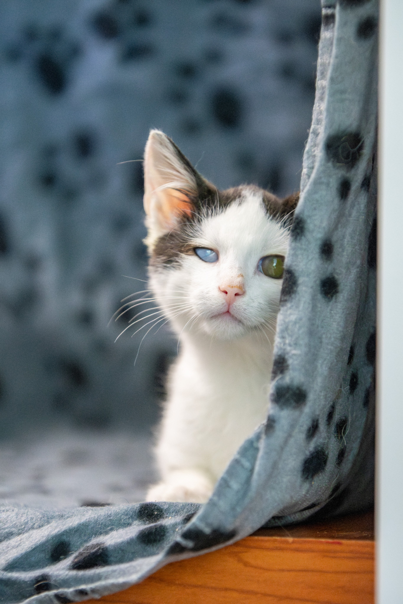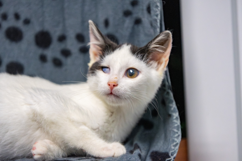 Życie go nie oszczędziło… Koci katar zebrał żniwo w postaci uszkodzenia oczu. Lewe oko: niestety nie widzi. Prawe oko: widzi, i jest szansa na zachowanie normalnego widzenia, o ile choroba wirusowa nie uszkodzi rogówki w przyszłości. Aktualnie brak zmian w rogówce. Trzeba uważnie leczyć i kontrolować, żeby choroba nie postąpiła. Widzenie obuoczne (normalne jak u zdrowego kota) – niestety mało prawdopodobne.
