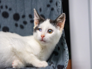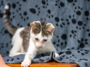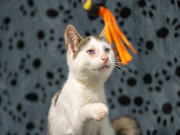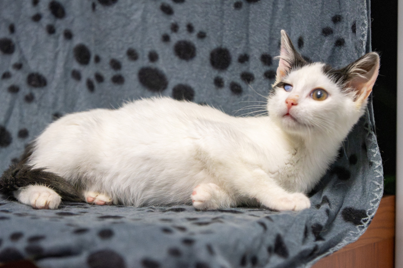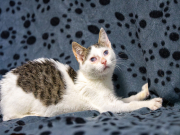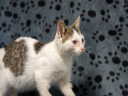ILOCZYN – biały z czarnymi plamkami na głowie, malutki, wyluzowany, mruczący, urzekający urodą kocur. Urodzony w lipcu 2025
