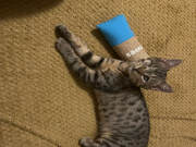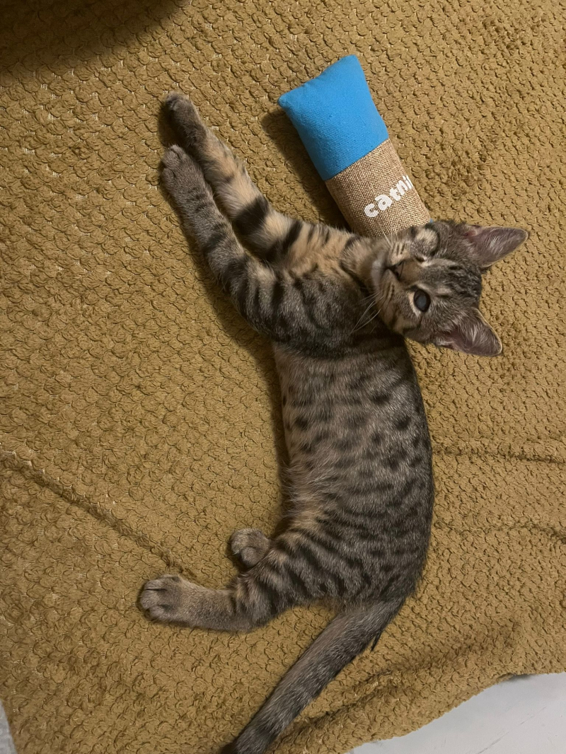 Bigosik lubi zabawy wędką, nie pogardzi też zwyczajnym kawałkiem papierka - ze wszystkiego zrobi sobie zabawkę. Najlepiej spędza mu się czas na mięciutkich posłaniach, albo na człowieku. Kuwetkuje już prawie bezbłednie.