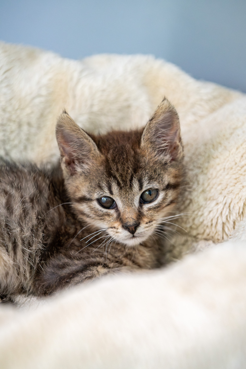 BIGOS - urodzony w sierpniu 2025. Jest wesołym kociakiem mimo trudnego startu. Bezdomność i koci katar dały się we znaki temu małemu kociakowi. Jego prawe oczko jest mniejsze i ma widoczną gołym okiem plamkę, która powoduje że na to oczko nie widzi. Prawe oko na szczęście ma zdrowe.