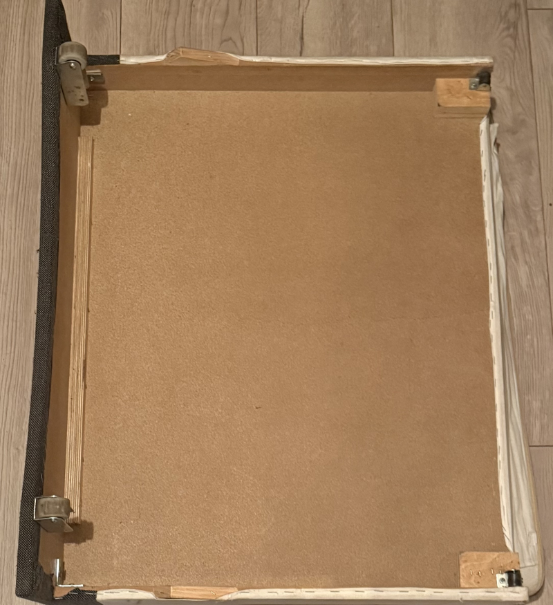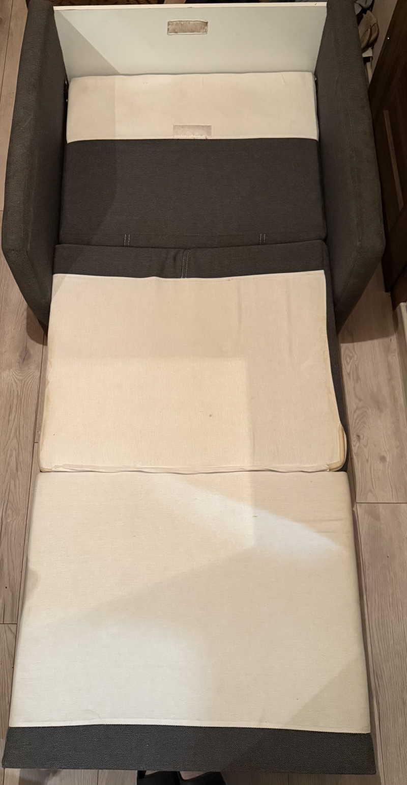 Posiada biały pojemnik na pościel, który wsuwa się po składaniu w fotel.