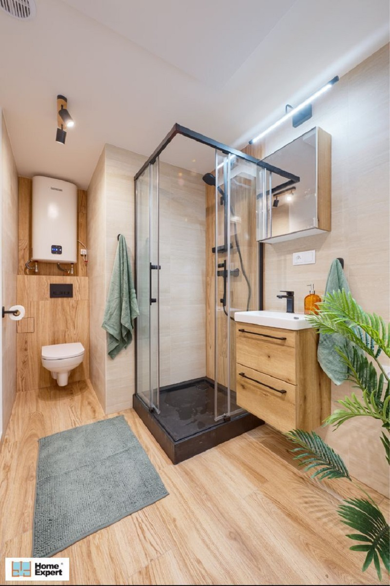 W łazience zastosowano jasne płytki i armaturę klasy premium.