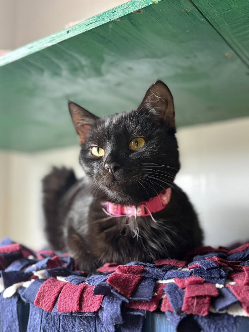 W schroniskowych warunkach żyje w zgodzie z innymi kotami.