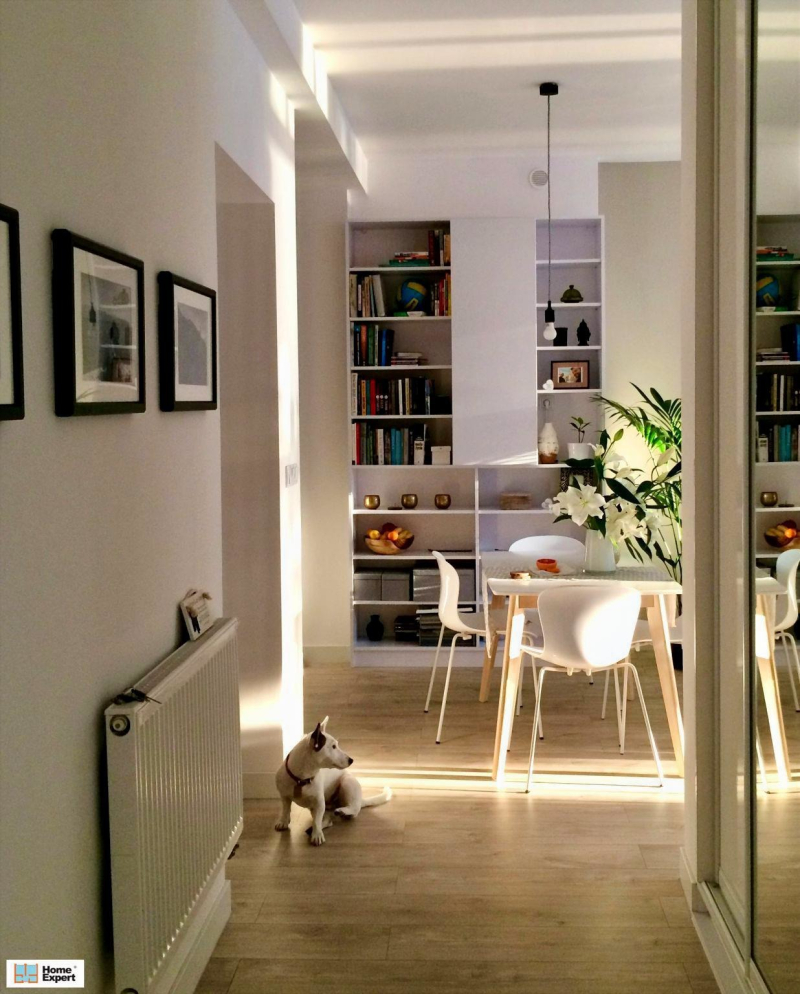 Salon z aneksem kuchennym został funkcjonalnie rozdzielony stylową kolumną, tworząc spójną,