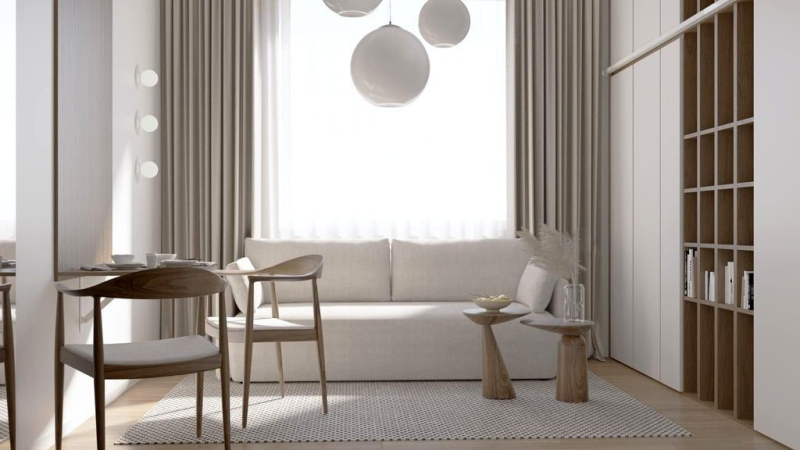• przestronny salon z aneksem kuchennym, nowoczesną zabudową i dużymi przeszkleniami,