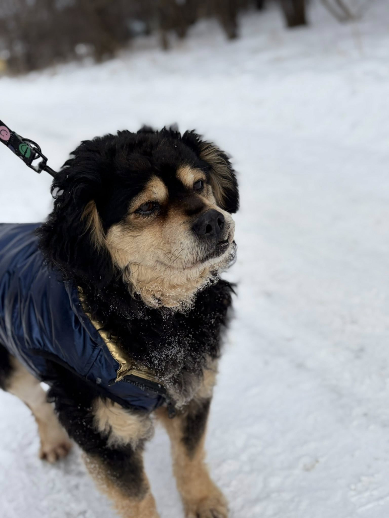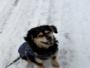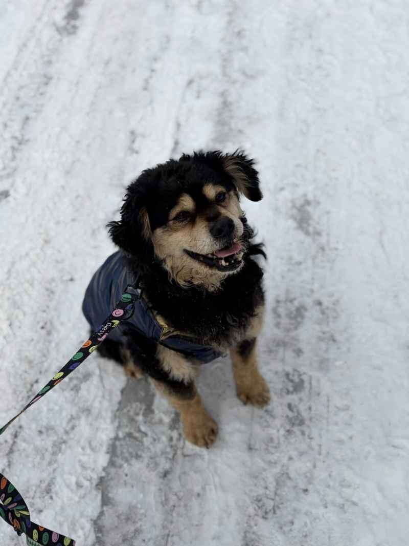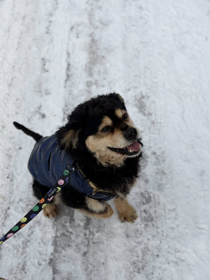 Jest pociesznym, średniej wielkości pieskiem (tak do kolana, na zdjęciach wygląda na większego, ale to złudzenie optyczne).