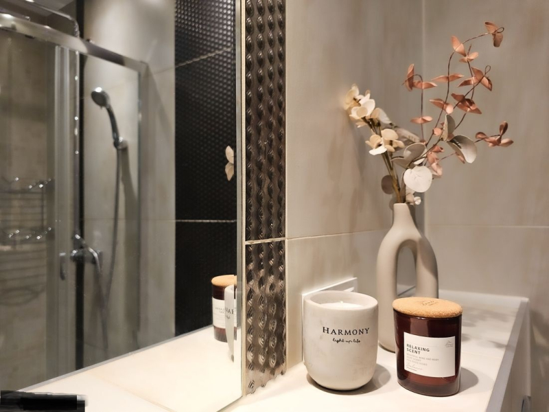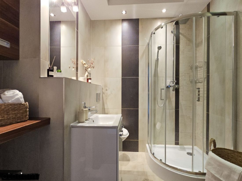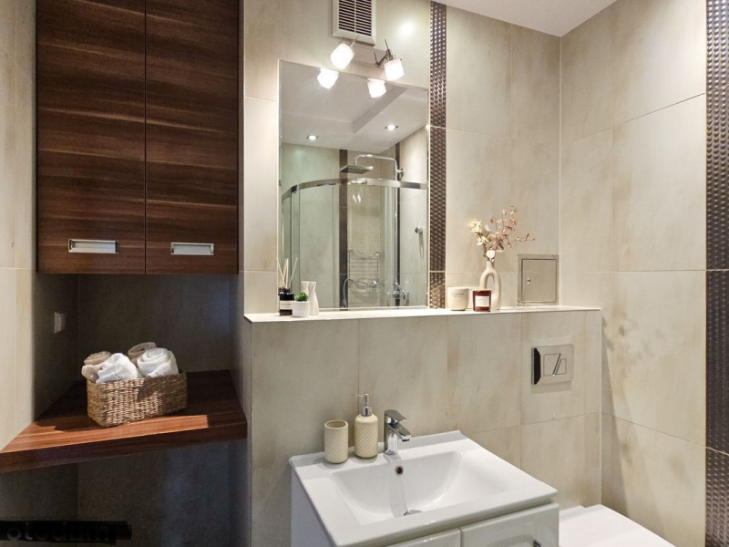 Łazienka: kabina prysznicowa, szafka pod wymiar, miejsce na pralkę i