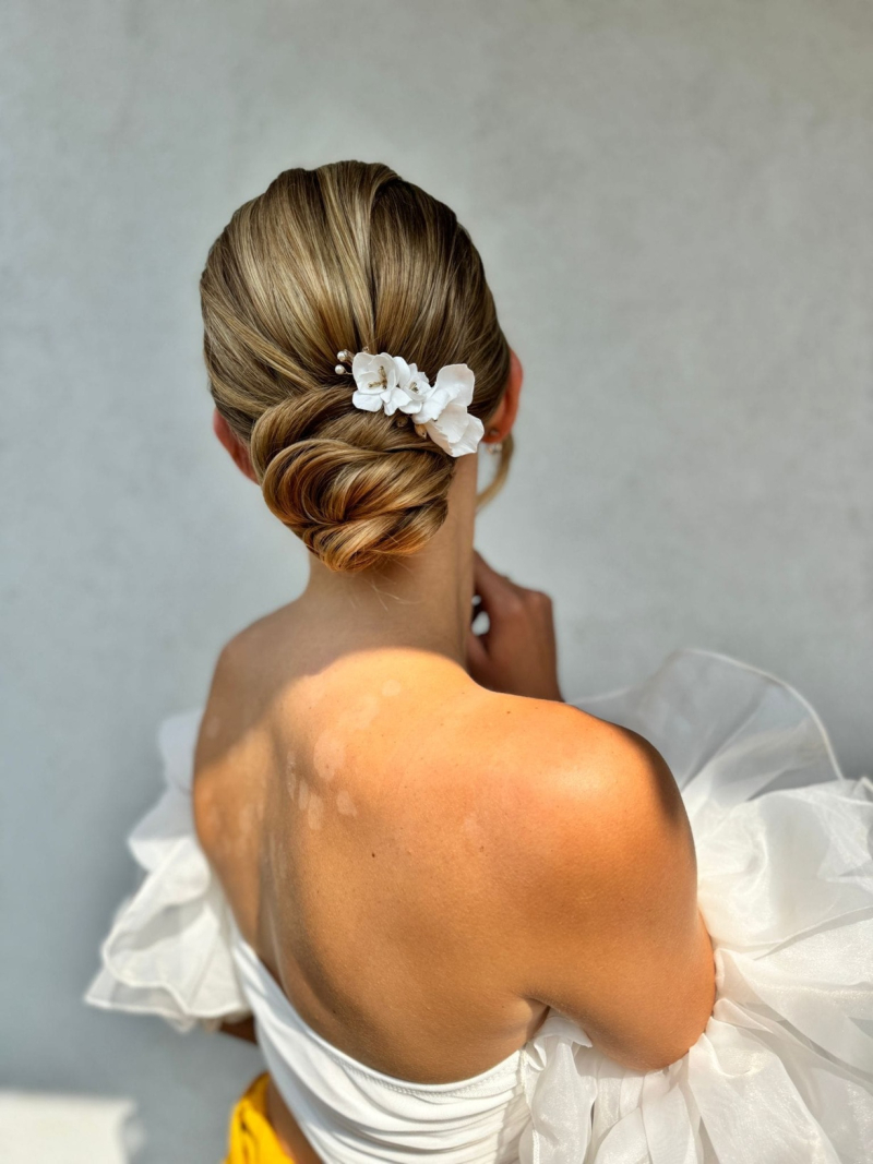 Daria wykonuje upięcia ślubne, fryzury próbne, stylizacje dla druhen, fryzury wieczorowe oraz fryzury do sesji zdjęciowych. Każda stylizacja jest tworzona z myślą o komforcie klientki – włosy są odpowiednio przygotowane, zabezpieczone i ułożone tak, aby wyglądały naturalnie i świeżo przez cały dzień.