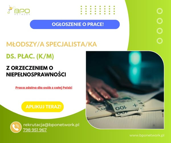 Młodszy Specjalista/Młodsza Specjalistka ds. płac. z orzeczeniem o niepełnosprawności - praca zdalna dla osób z całej Polski