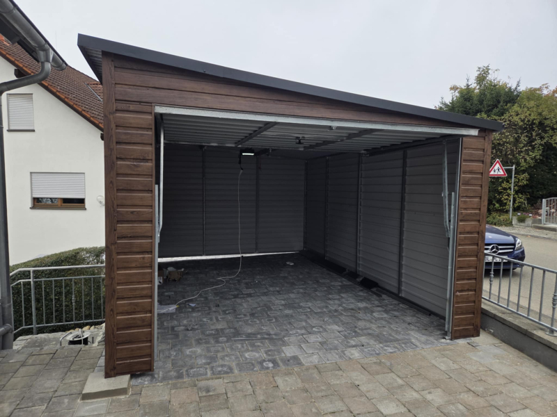 Szukasz solidnego, przestronnego i estetycznego miejsca na samochód? Wybierz garaż blaszany o wymiarach 3,5 x 5 m. Ciemny Orzech w połączeniu z Ciemnym Grafitem sprawia, że garaż doskonale komponuje się z architekturą nowoczesnych i klasycznych posesji. To idealne rozwiązanie nie tylko dla aut, ale też jako przestronny warsztat lub magazyn ogrodowy.