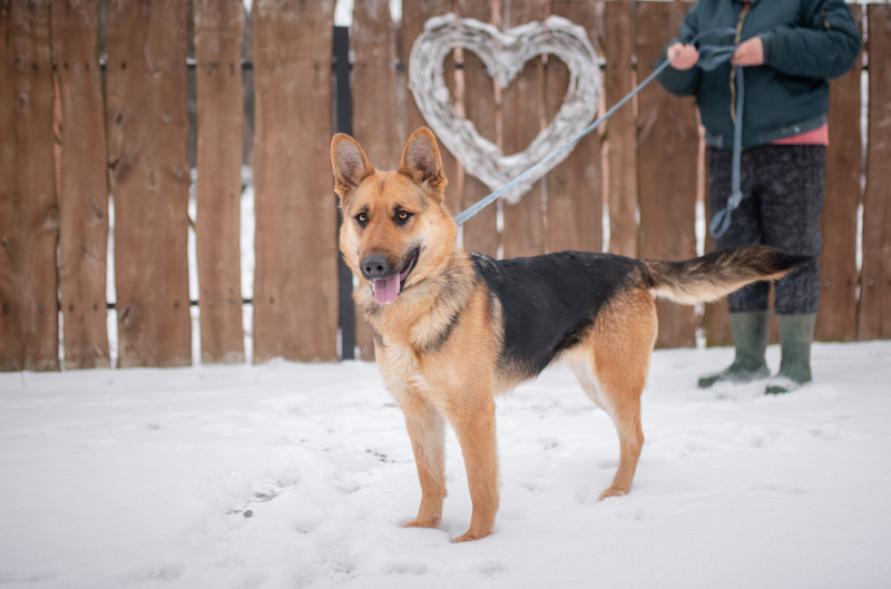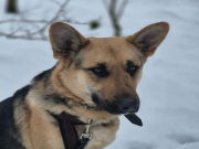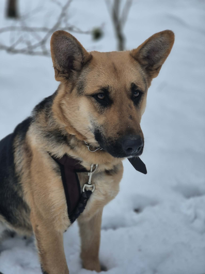 To młoda sunia, w typie owczarka, która ma w sobie mnóstwo pozytywnej energii i ciekawości świata.