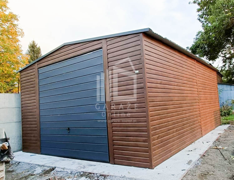 GARAŻ BLASZANY 5m x 7m poziom - dwuspad - Brama uchylna - ciemny orzech - podwyższenie ID109 5x7